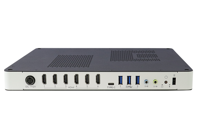 | I/O Interface | 6x HDMI 1.4b 3x USB 3.2 1x USB type-C 1x Audio connector for Line-out/Mic-in 1x Power / HDD LED 1x Power button 1x Power jack connector |