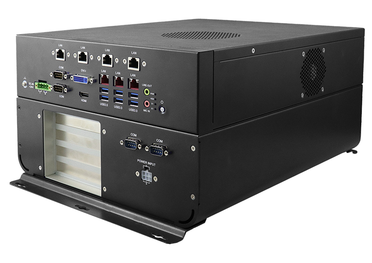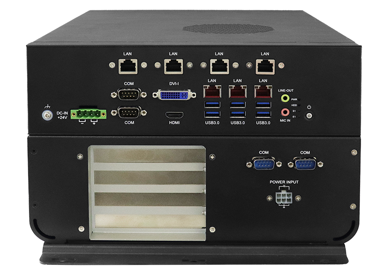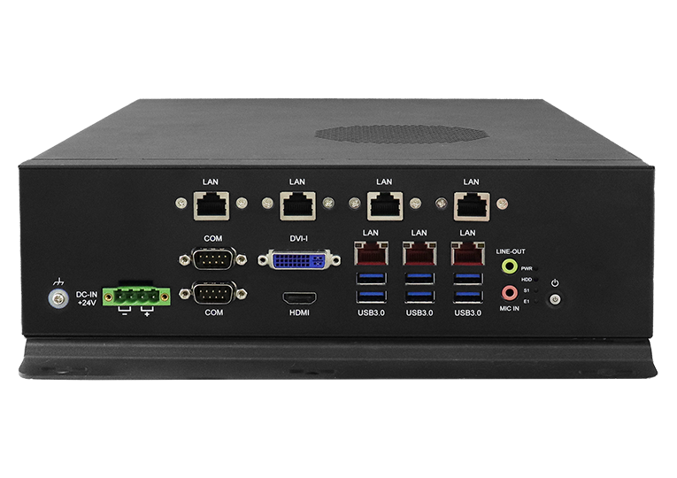 | Front Panel External I/O | 1x HDMI, 1x DVI-I 6x USB 3.x 3x RJ45 for Gigabit LAN 2x RS-232/422/485 COM ports 2x RS-232 COM ports 1x Audio connector for Line out Power / HDD LED, power button 1x DC-In power connector for system power |