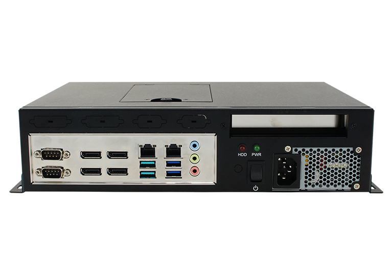 | Rear-side Panel I/O | 2x COM 4x DisplayPort 1.4 2x RJ-45 Gigabit Ethernet port 2x USB 3.1 ports 2x USB 2.0 ports 1x Audio port for [Line-in / Line-out / Mic-in] 1x AC-inlet, 1x Power button 1x Power LED, 1x HDD LED |