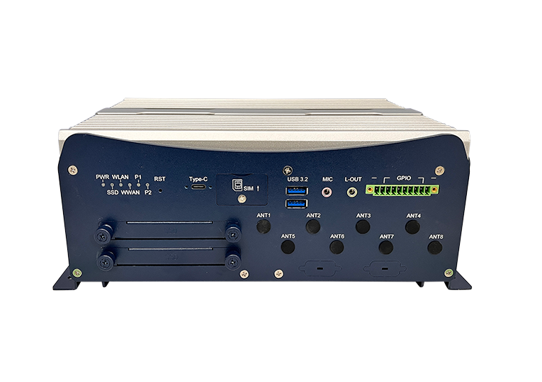 | Front panel I/O | 2x USB3.2 Gen2 stack Type-A connector 2x External accessible SIM socket 1x USB Type-C connector with screw-lock 2x Removable 2.5“ SSD device bay 1x 3.5mm green color audio for Line-out 1x 3.5mm pink color audio for MIC-in 1x Reset button 1x 10-pin terminal block for isolated digital I/O 8x SMA antenna holes 6x Light-pipe for status LED indicators (2x programmable) |